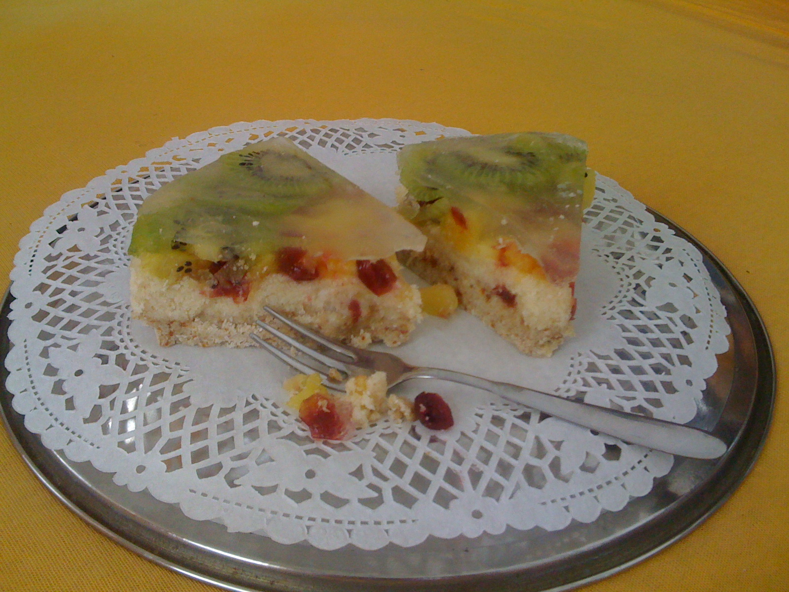 Növényi eredetű tortazseléport pár csepp steviával felfőzünk, majd megvárjuk míg langyos lesz és ráöntjük a gyümölcsös rétegre.