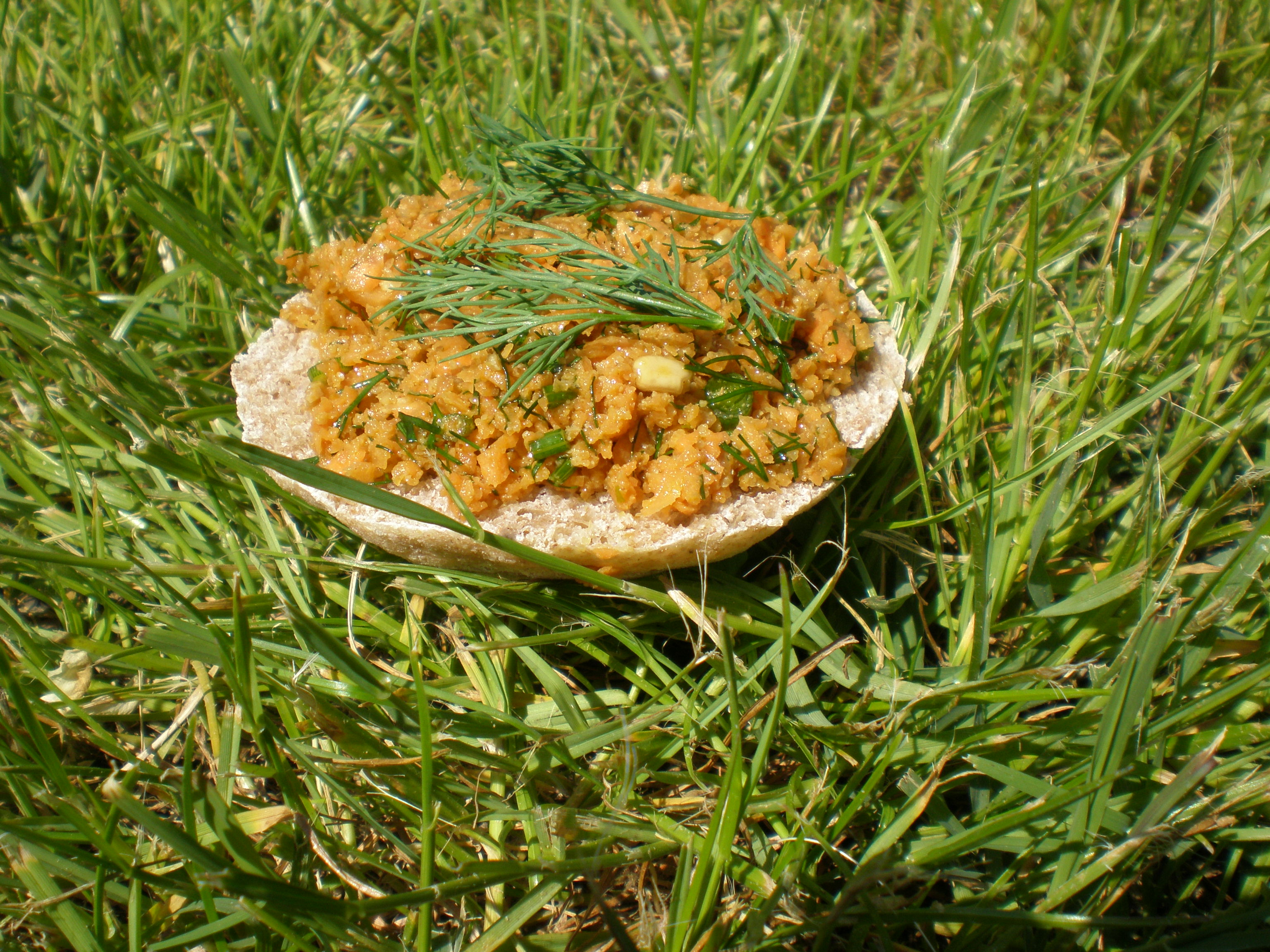 A sárgarépát apróra reszeljük és a szintén apróra vágott kaporral, az olíva olajjal, jól összekeverjük.