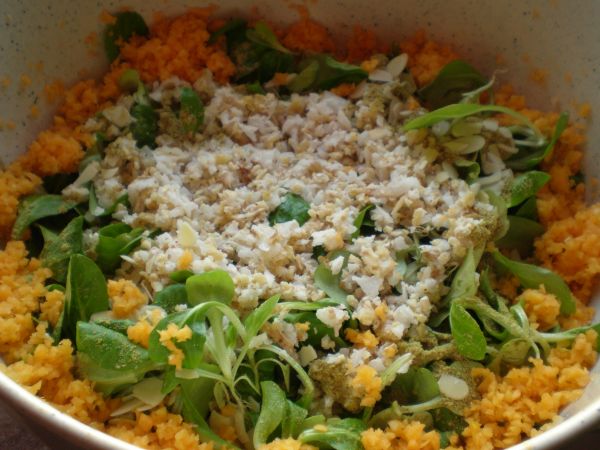 Ami szükségeltetik: ruccola- madárbegy saláta – sütőtök – jégcsap és fekete retek – fénygyökér – őrölt tökmag – darált dió - mandulapehely – hidegen sajtolt olaj – só