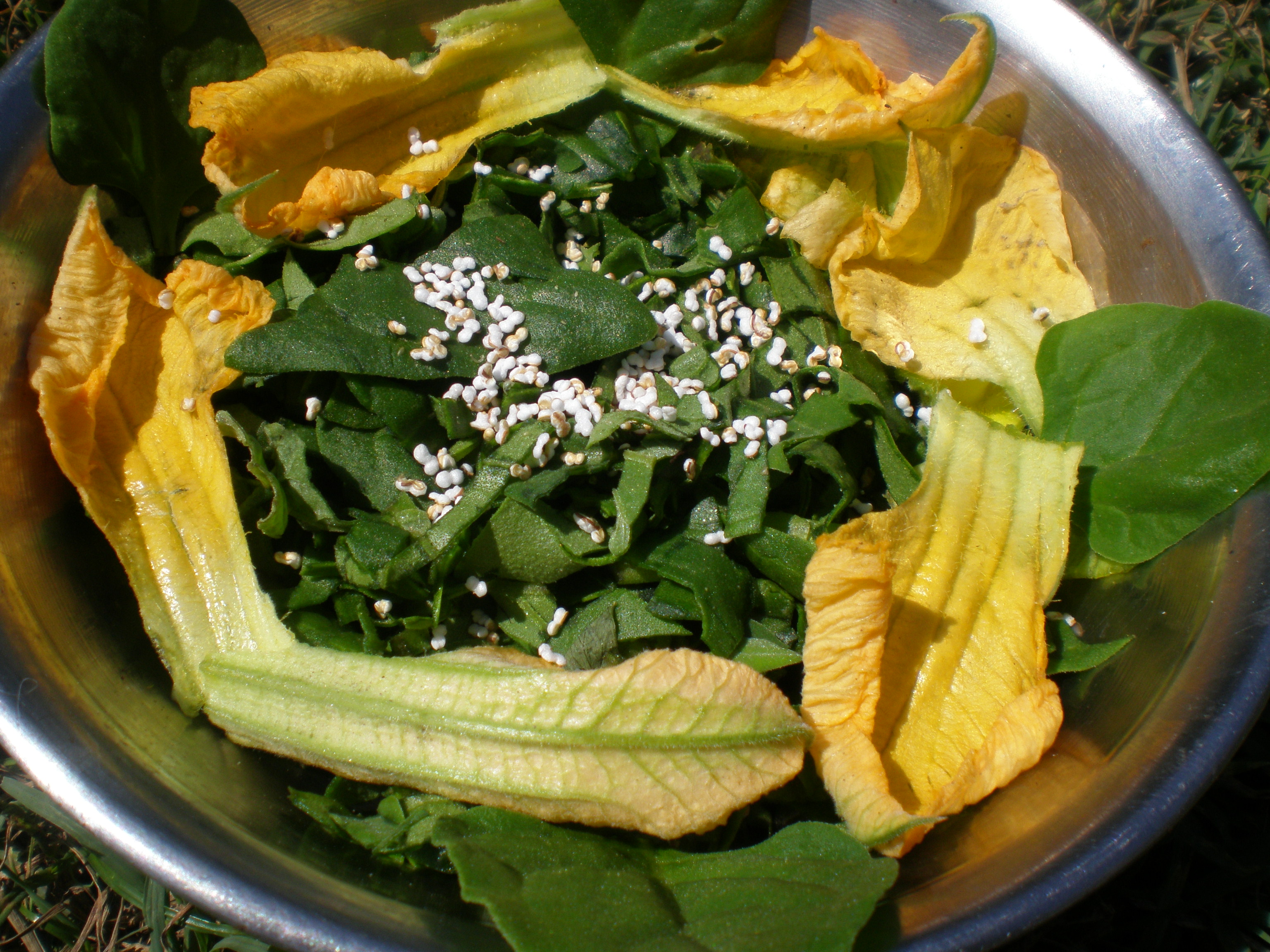 Ami kell: új-zélandi spenót levele - disznóparéj - tök vagy cukkini virág - papsajt - porcsin - puffasztott amaránt mag - hidegen sajtolt olaj - só