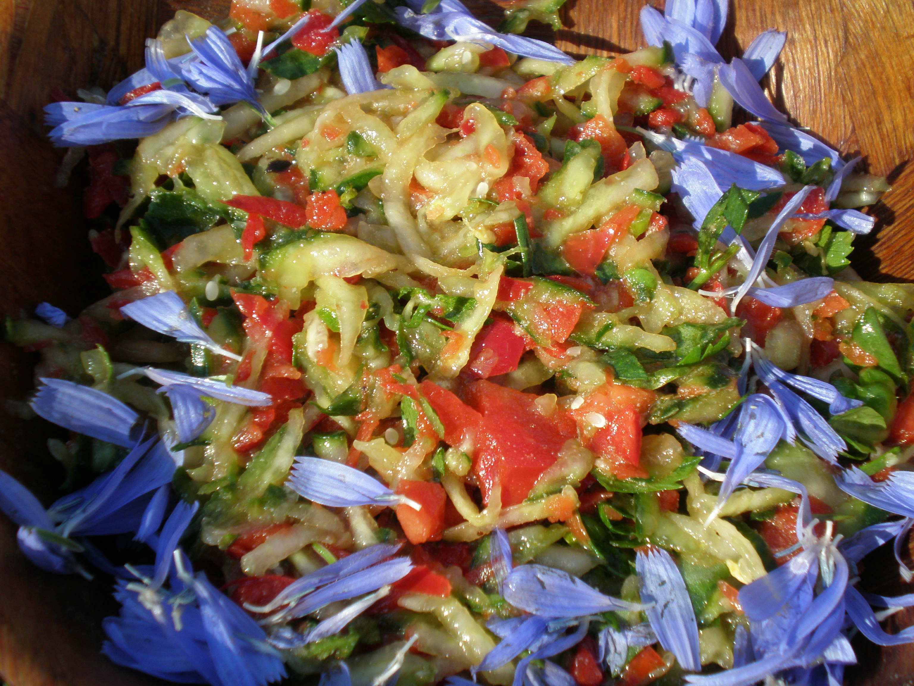Hozzávalók: uborka - piros paprika – bazsalikom, kakukkfű levél – porcsin – ördöggyökérpor – tökmagolaj – katángkóró virág – sörélesztőpehely - himalája só
