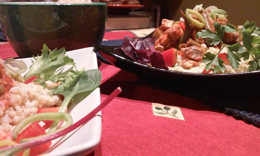 A közben szépen bedagad, kölessel megágyazok a pirított tofumnak, megszórom a tetejét a maradék felkarikázott póréval és egy kis petrezselyemmel. És bele is merülhetünk a gasztronómiai élvezetbe!
